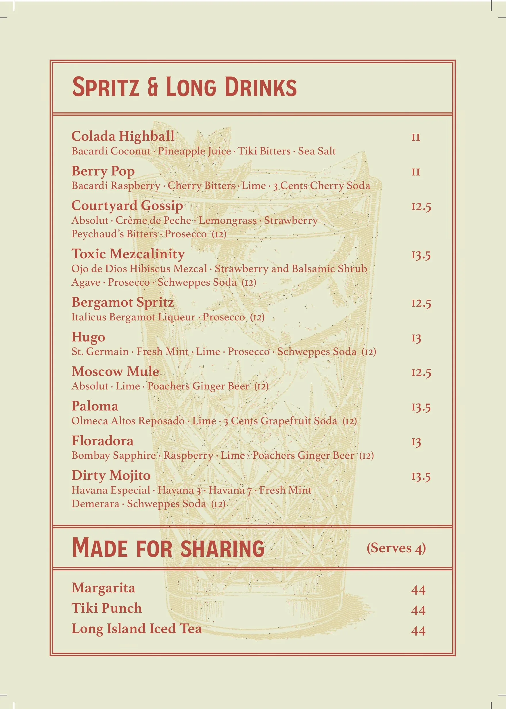 Menu featuring cocktails and drinks with the section title 'Spritz & Long Drinks' in red font. The menu includes various cocktails such as Colada Highball, Berry Pop, Courtyard Gossip, Toxic Mezcalinity, Bergamot Spritz, Hugo, Moscow Mule, Paloma, Floradora, and Dirty Mojito, with their ingredients and prices. The bottom section titled 'Made for Sharing' lists Margarita, Tiki Punch, and Long Island Iced Tea, each priced at 44.
