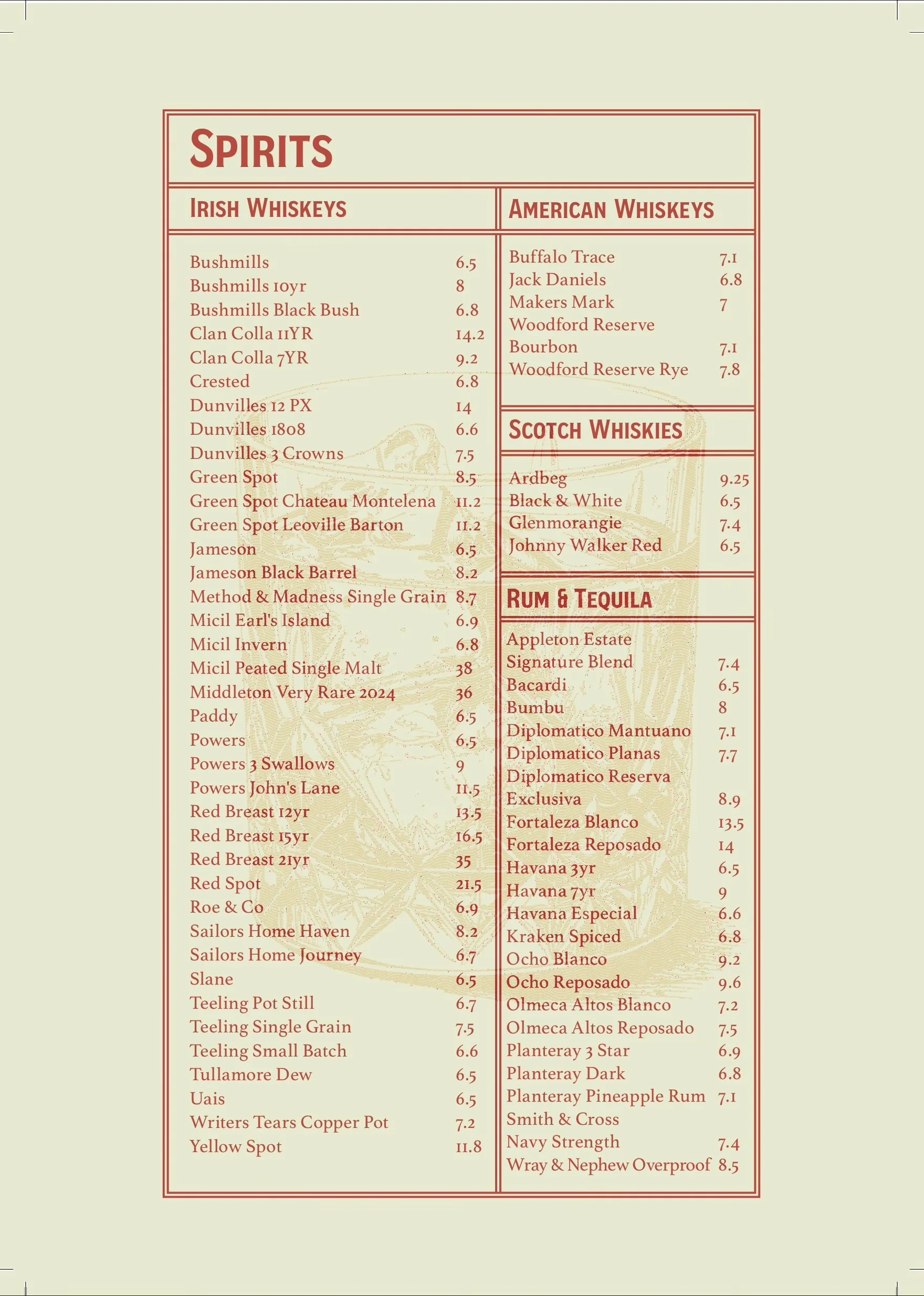 A vintage-style whiskey menu listing various Irish, American, Scotch whiskeys, and rum and tequila options with prices.